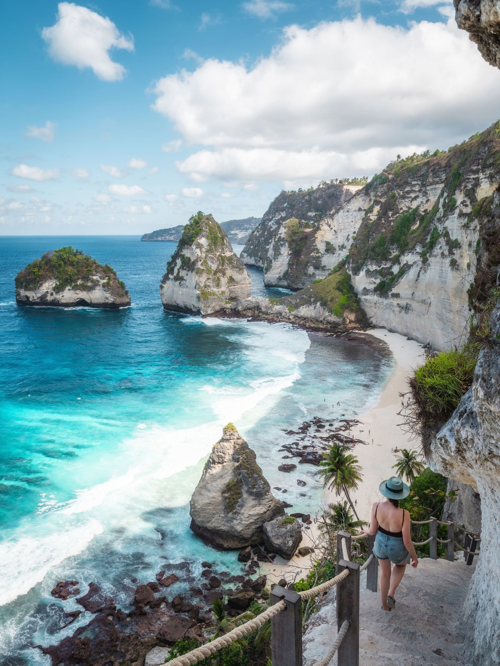 The adventure typically begins with a scenic boat ride from Bali to Nusa Penida, followed by a drive through lush hills and winding roads to the island’s eastern attractions. The first stop is often Diamond Beach, a postcard-perfect beach nestled beneath steep cliffs, named after the diamond-shaped rock formations that rise from the turquoise sea. A newly built staircase carved into the cliffside allows visitors to descend safely to the beach, where they can relax on soft white sand or take in the awe-inspiring views.